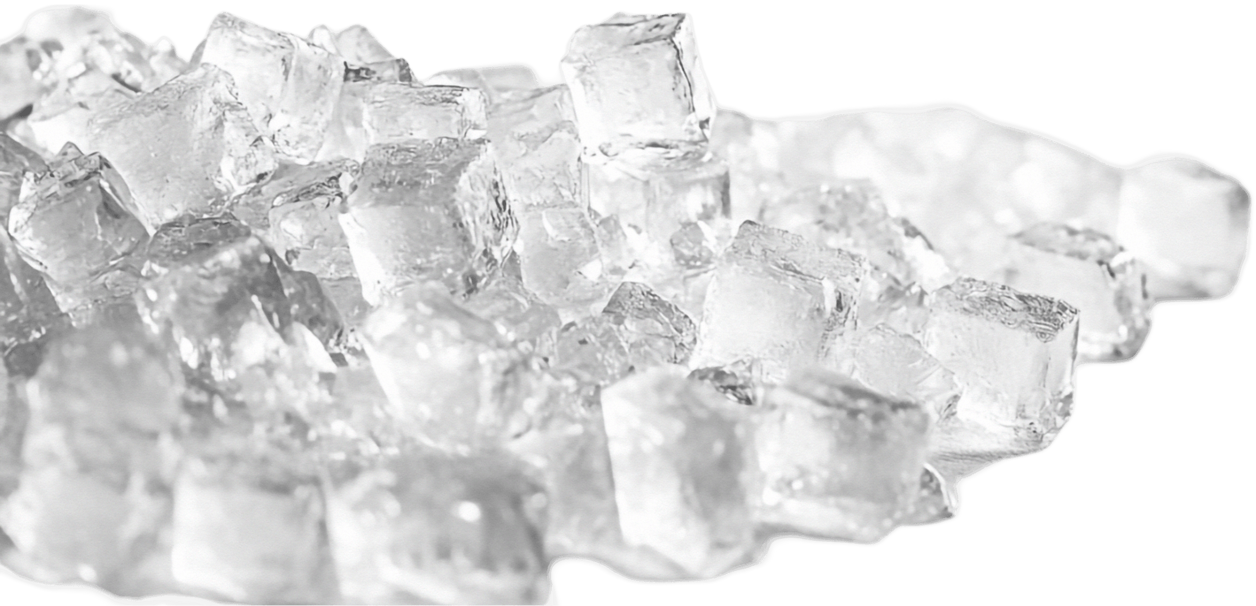 Gelo cristalino e resistente, ideal para manter bebidas geladas por mais tempo sem alterar o sabor.